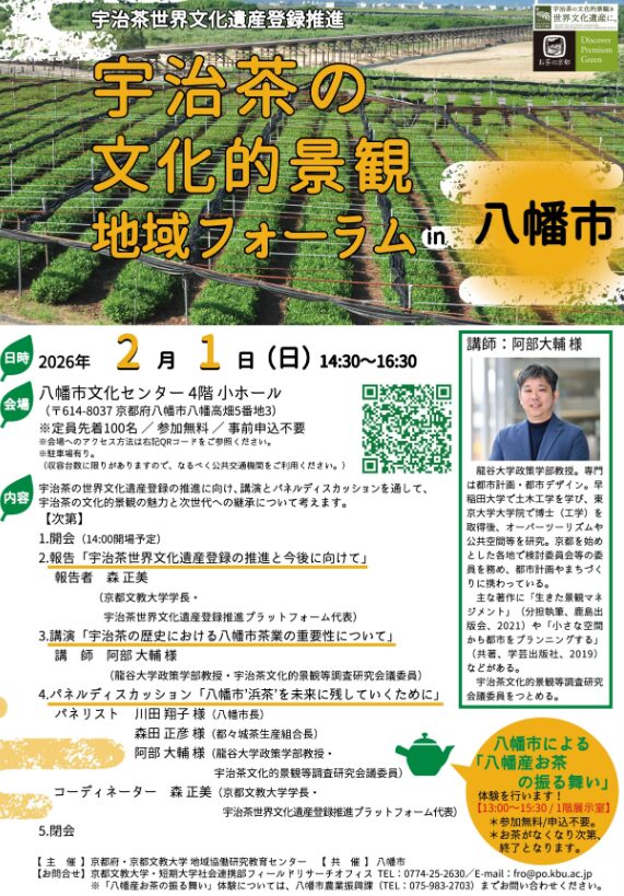 2/1に、京都府・京都文教大学 地域協働研究教育センター共催による 「宇治茶の文化的景観地域フォーラムin八幡市」 が下記の通り開催されます。